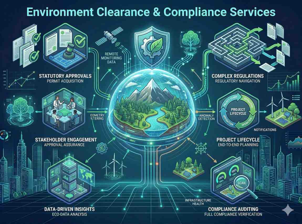 Our Environment Clearance & Compliance Services offer comprehensive support to navigate the intricate landscape of environmental regulations. We ensure your projects meet all statutory requirements, from initial approvals to ongoing compliance, facilitating smooth and responsible development.