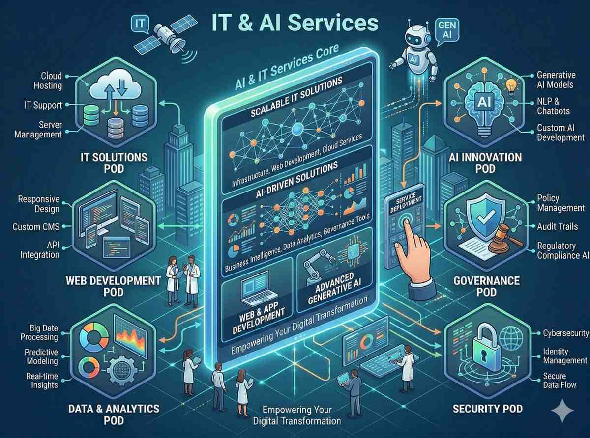 We deliver scalable IT and AI-driven solutions customized to business and governance needs. From web development to advanced Generative AI, we empower your digital transformation.