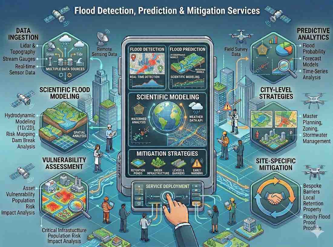 Our Flood Detection, Prediction & Mitigation Services offer comprehensive scientific modeling combined with practical strategies to manage flood risks. We provide detailed analysis for both urban and riverine environments, helping you build resilience.